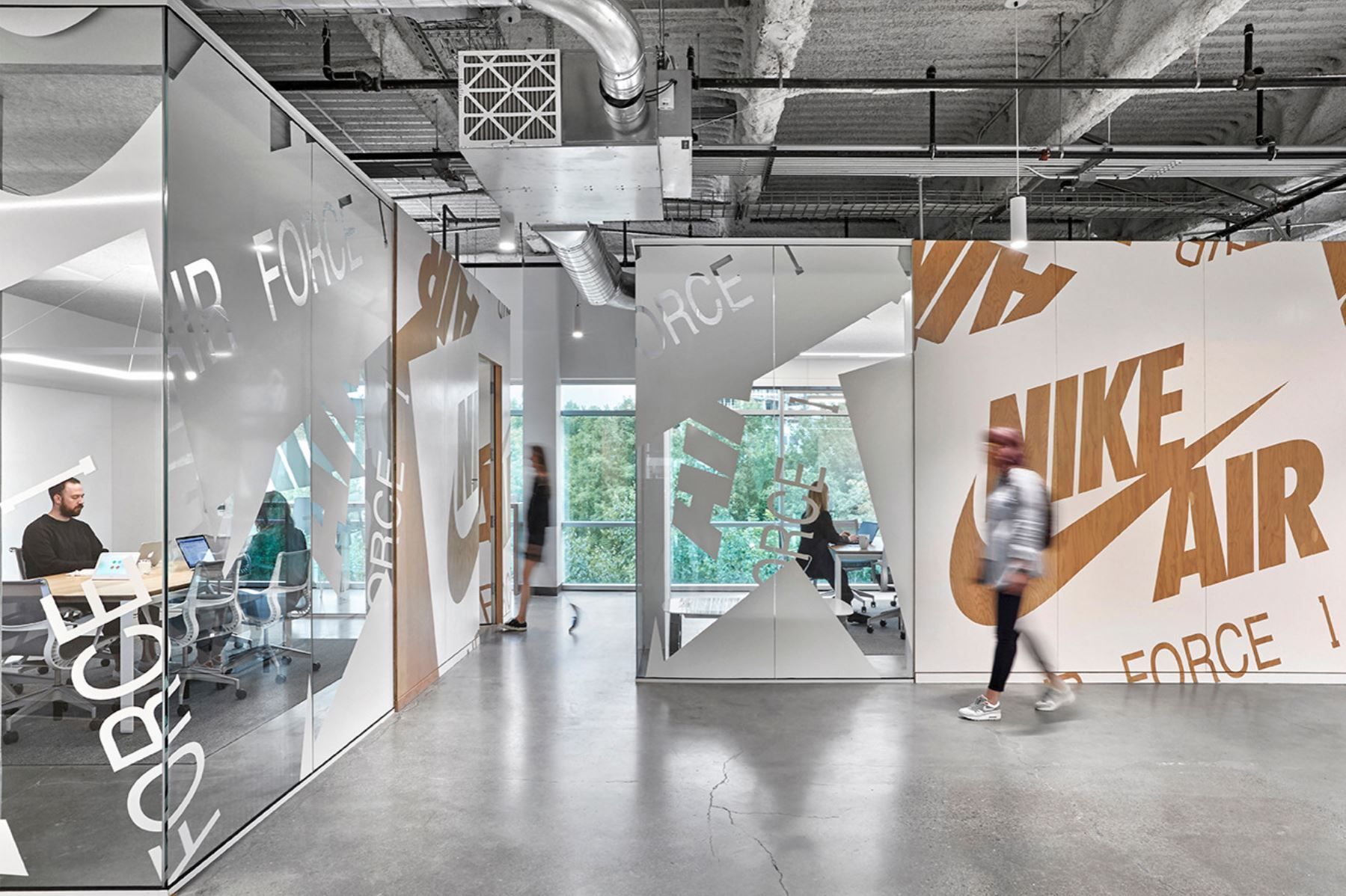 Within workplace environments, Nike integrates brand identity through carefully curated interior design elements, including branded signage, artwork featuring athletes and iconic campaigns, and installations that celebrate Nike's History and Values.