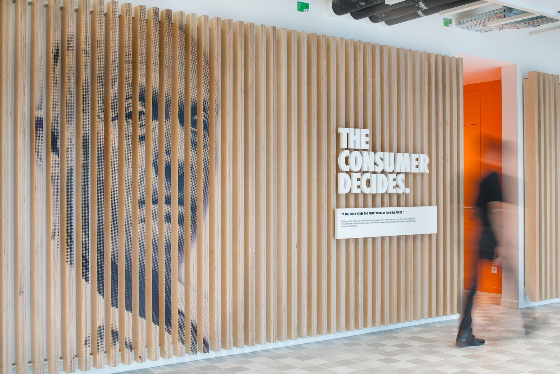 Brand statements, inspirational quotes, campaign taglines or other text can be used to deliver impactful statements or quotes in the Brand voice. Text-based elements can vary in scale to deliver information up close or inspire from a distance, and can be formal or expressive. Oversized text can be used as a memorable wayfinding beacon (e.g. floor or room number). Avoid using text as a design element where it can be unintentionally mistaken for wayfinding signage.