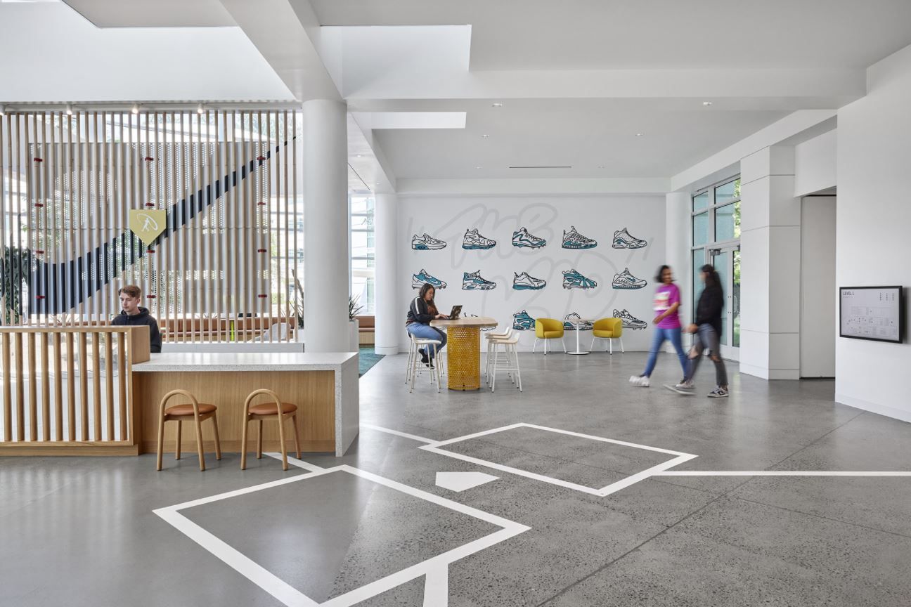 At the moment of entry, an immersive basketball court installation is both playable and eye-catching. While still functional, the unconventional design, using numerous forms and materials, generates interest. Be strategic in placement and reserve moments like this for areas with maximum impact.