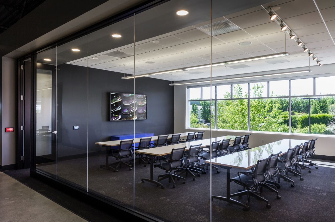 Consider adding simple brand treatments on walls that may serve as a virtual meeting backdrop, taking care not to impair the visibility and legibility of whiteboard content. Artful overhead lighting configurations can also embed branding into the environment, as long as functional lighting is not compromised.